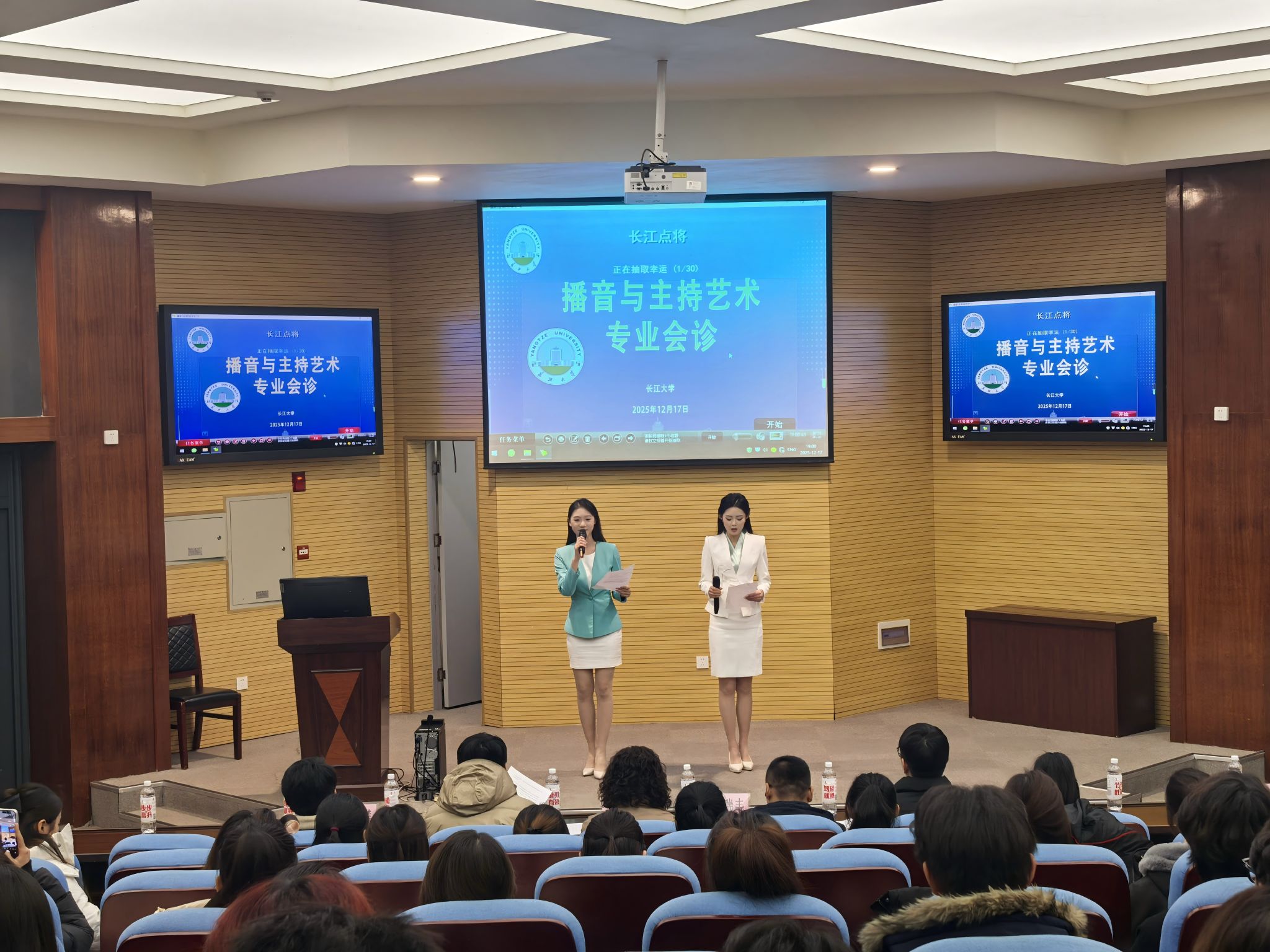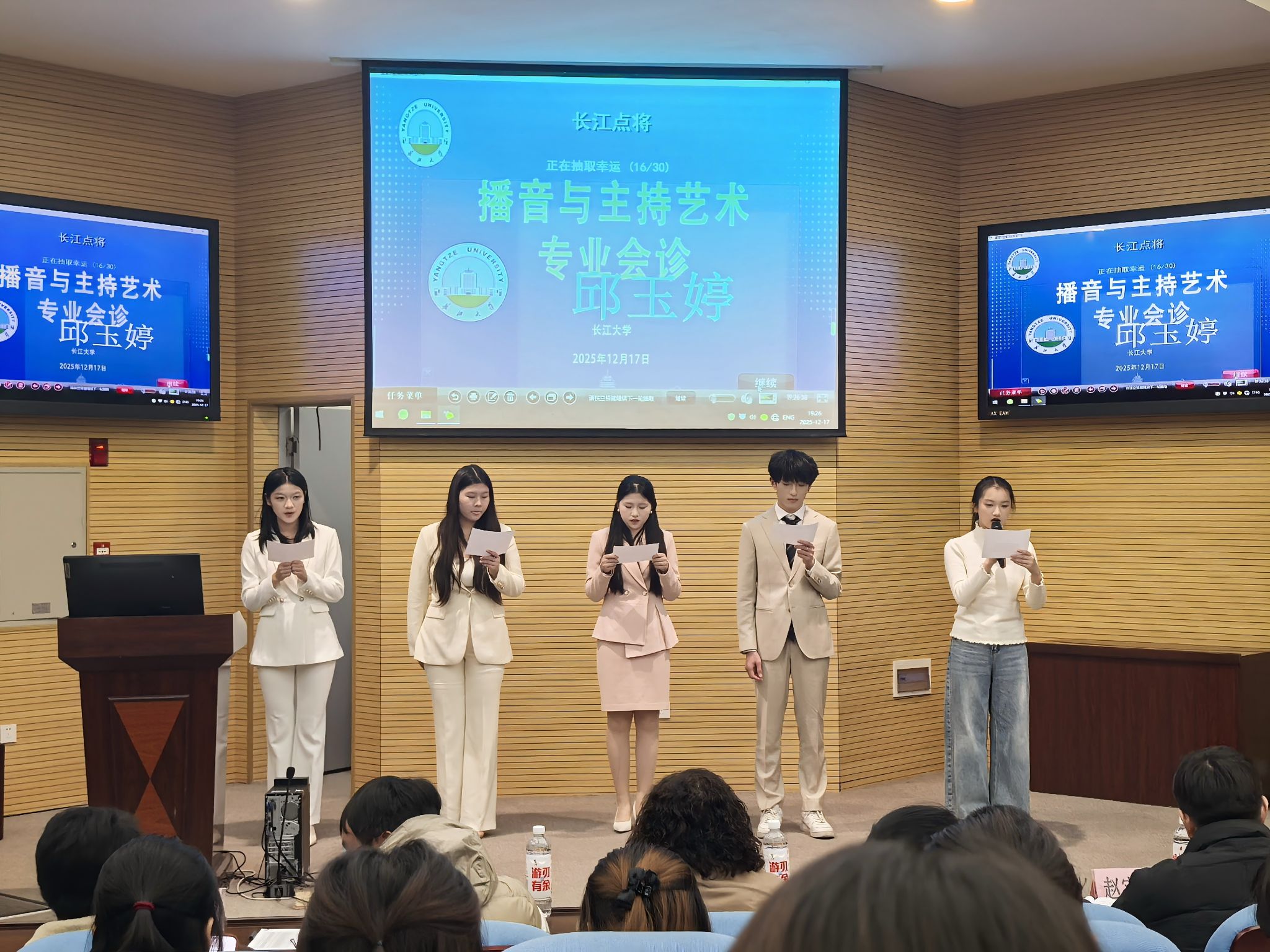 (通讯员:窦语晨)2025年12月17日晚,传媒学院在荆州西校区举办了“长江点将”播音与主持艺术专业会诊活动。传媒学院常务副院长郑瑞丰、副院长李琴出席,湖北广播电视台新闻中心记者万力源、长江大学外国语学院省级普通话测试员赵宇杰、传媒学院播音与主持艺术专业教研室主任柴攀组成专业评审团,在播音与主持艺术专业韩雅茜老师的组织下,共同为2025级播音与主持艺术专业学生会诊指导。